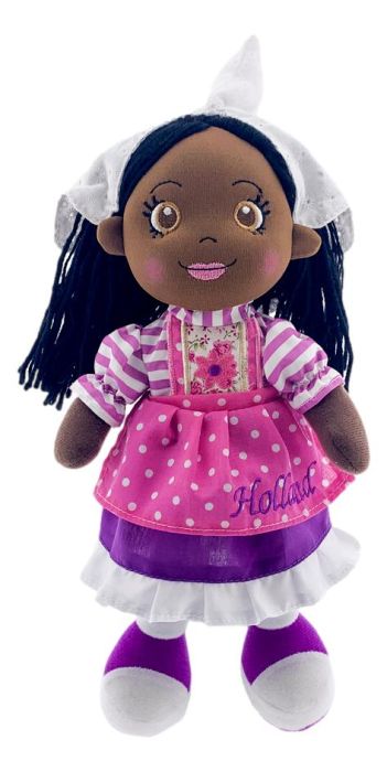 Het vrolijk gekleurde paarse kostuum is voorzien van de tekst "Holland".