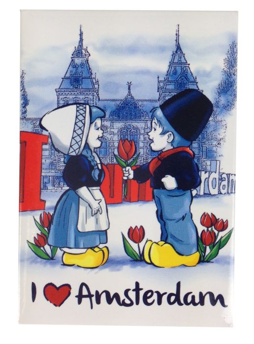 Deze vrolijke koelkast magneet laat een Nederlands paartje zien in traditionele kledij en versierd met tulpen. Ze staan voor de grote wit met rode "I love Amsterdam" letters zoals die op het Museumplein voor het rijksmuseum zijn opgesteld.