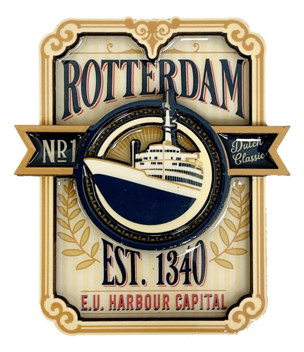 Deze koelkast magneet is ontworpen in de populaire Art Deco stijl en zal zeker de aandacht trekken van iedereen die hem ziet. De magneet heeft een elegante beige achtergrond die versierd is met de tekst "Rotterdam - EU Harbour City", wat de belangrijke rol van Rotterdam als belangrijke havenstad van Europa benadrukt.