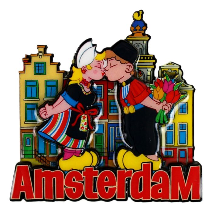 Deze magneet laat een kussend Amsterdams paar zien voor een stel grachtenhuizen. Onder het paar staat "Amsterdam" in rode letters.