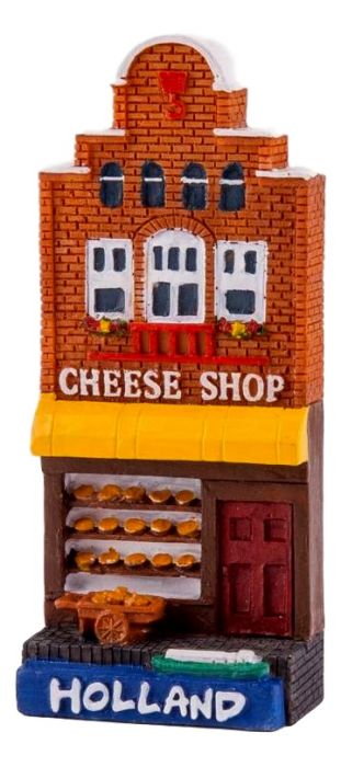 Van kunststeen gemaakte koelkastmagneet in de vorm van een Amsterdams grachtenpand met kaaswinkel op de benedenverdieping.