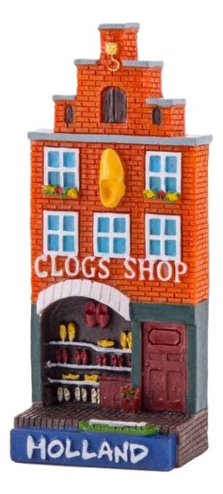Van kunststeen gemaakte koelkastmagneet in de vorm van een Amsterdams grachtenpand met klompenwinkel op de benedenverdieping.