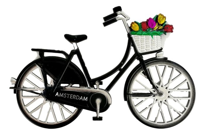 Metalen koelkastmagneet in de vorm van een typische Amsterdamse zwarte fiets met de tekst 'Amsterdam' op het kettingkast. Een mandje met gekleurde tulpen zit voor het stuur. Voorzien van twee magneten houdt deze magneet zich stevig vast op elke ijzeren ondergrond. De fiets meet 9,5 cm bij 6 cm.