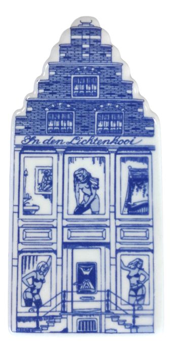 Koelkast magneet van een Delfts blauw grachtenhuis met daarin een sex huis "De Lichtenkooi".