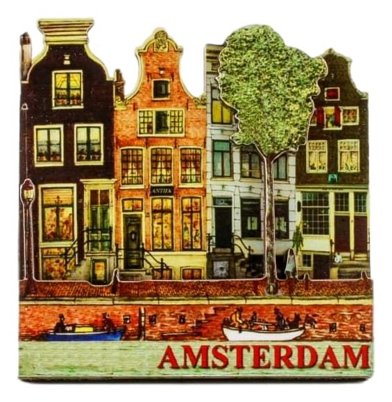 Deze uit twee lagen bestaande koelkastmagneet laat een straatje van de hele typische Amsterdamse huizen zien met daarvoor een gracht vol plezierboten. Deze magneet is 7 cm x 7 cm groot.