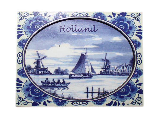 Kleine Delfts blauw gekleurde magneet met molens en boten.