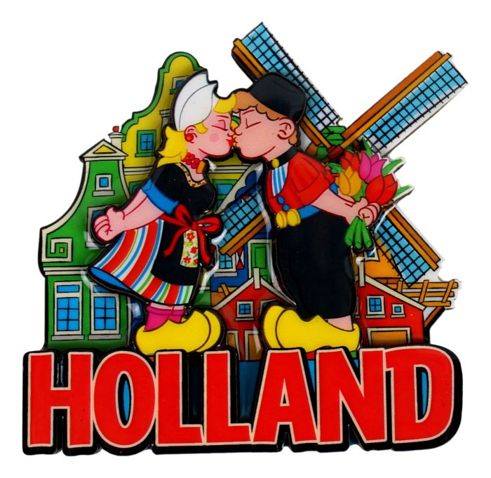 Deze magneet laat een vrolijk kussend Hollands boerenpaar zien voor een stel Zaanse huisjes en een molen. Onder het paar staat "Holland" in rode letters.