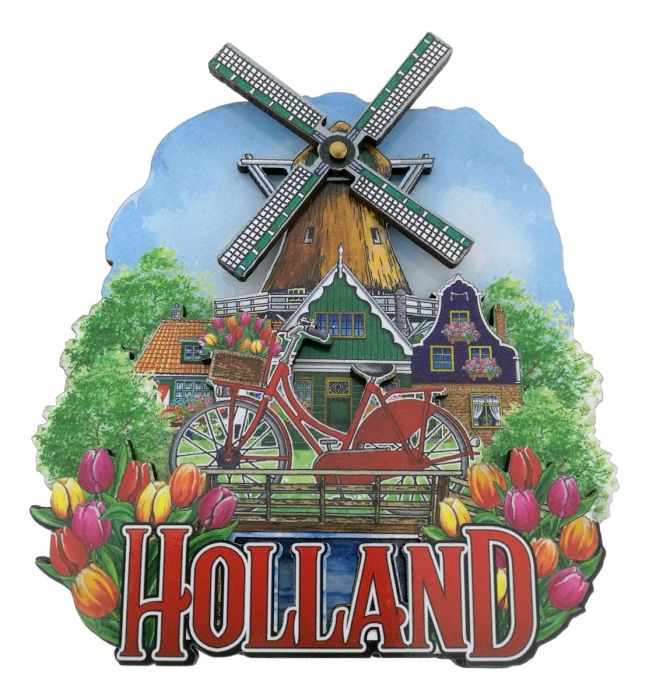 Grote vrolijk gekleurde Holland Magneet met een fiets op de voorgrond, en een molen met wieken op de achtergrond.