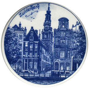 Ronde, keramieke Delfts blauwe koelkastmagneet met een afbeelding van de Amsterdamse Zuiderkerk en grachtenhuizen.
