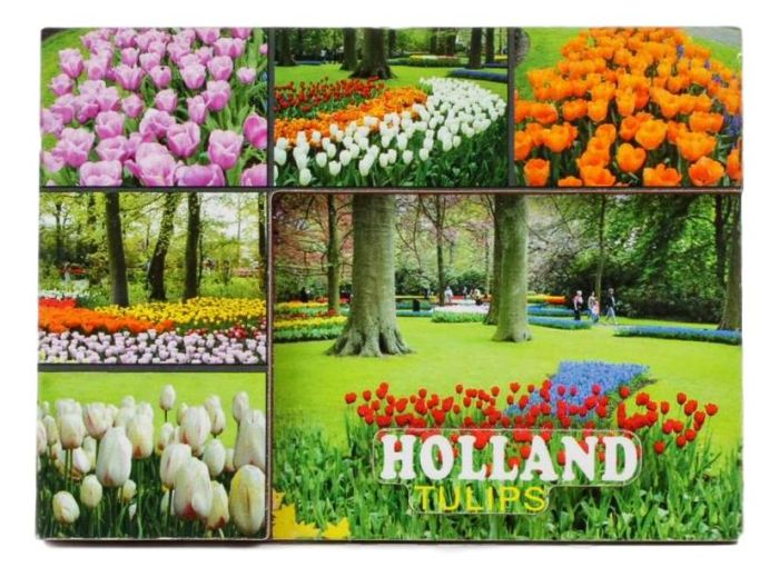 Mooi gekleurde magneet gemaakt van hout in 2 lagen. De magneet laat allerlei tulpen in de Keukenhof zien en heeft de tekst "Holland Tulips".