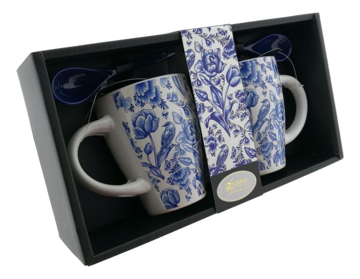 Set van twee grote keramische koffie of thee mokken met bijpassende blauwe lepels in een geschenkdoos met doorzichtig venster. Elke mok is versierd met delfts blauwe tekeningen. Een mooie set van twee mokken om als geschenk te geven.