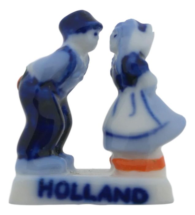 Dit kleine keramieken Delfts blauwe kussend paartje is leuk als geschenkje op een huwelijk.