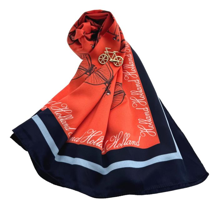 Voeg een vleugje elegantie toe aan je outfit met deze prachtige zijden sjaal, geïnspireerd door de charme van Holland. De sjaal heeft een verfijnd ontwerp met een warme rood-oranje tint, zwarte accenten en delicate illustraties van vlinders. De rand is stijlvol afgewerkt met een diepblauwe omlijsting en sierlijke "Holland" belettering, wat zorgt voor een tijdloze uitstraling.
