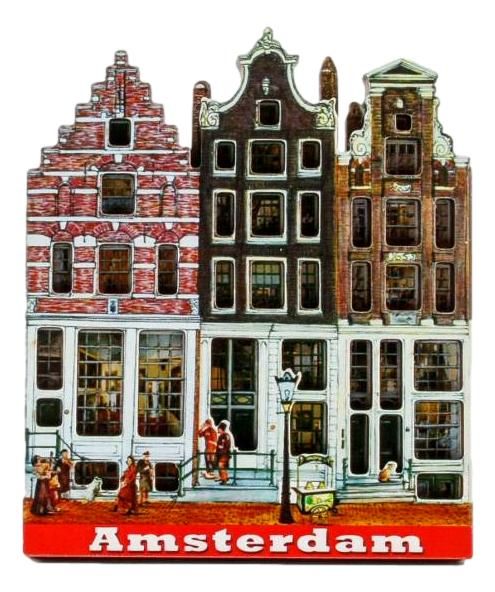 Klassieke koelkast magneet versierd met 3 verschillende Amsterdamse grachtenhuisjes, en daaronder de tekst "Amsterdam".