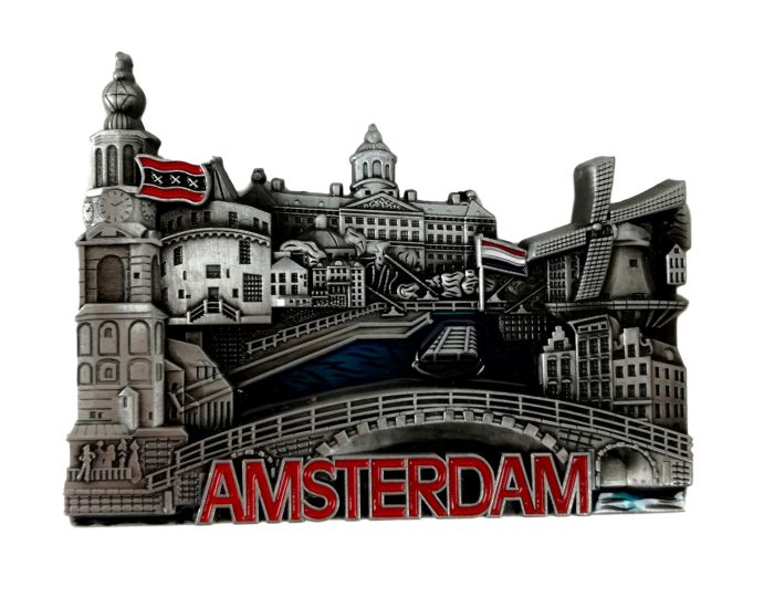 Kleine tinkleurige metalen koelkastmagneet met een compilatie van verschillende bekende Amsterdamse gebouwen.