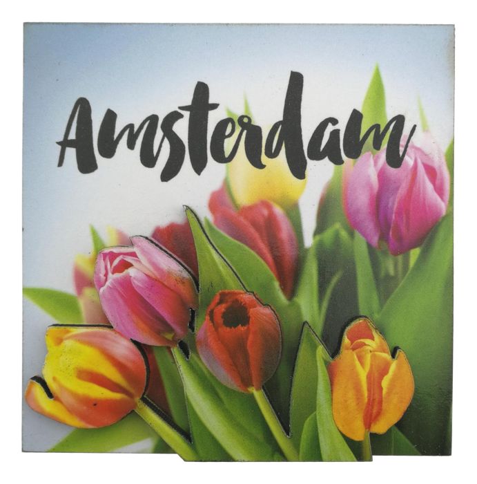 Het is lente met gekleurde tulpen en de tekst Amsterdam op een grote vierkante magneet. De magneet bestaat uit twee lagen MDF (hout) op elkaar. De magneet is 7,5cm bij 7,5cm groot.
