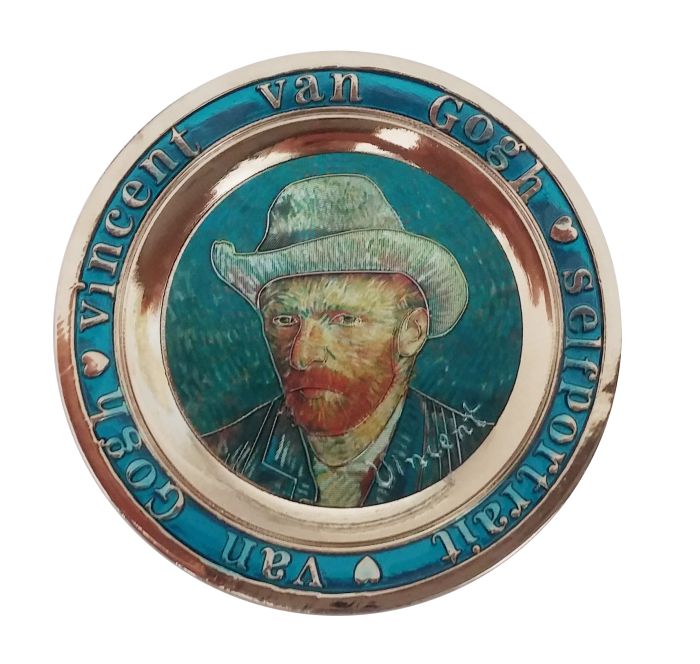 Klein glimmend, metalen magneetbordje met daarop een zelfportret van de schilder Vincent van Gogh.