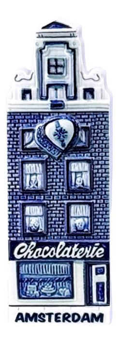 Keramieken grachtenhuis magneet in het Delfts Blauw versierd met een chocolade winkel.