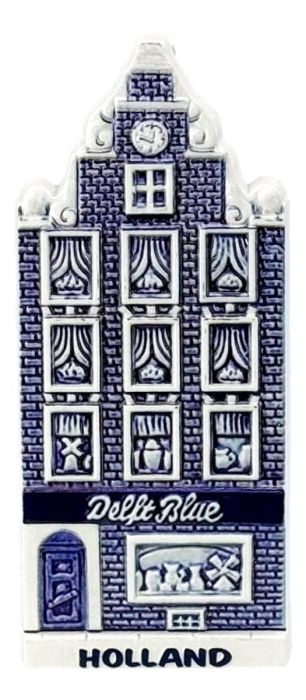 Keramieken grachtenhuis magneet in het Delfts Blauw versierd met een Delfts Blauw winkeltje.
