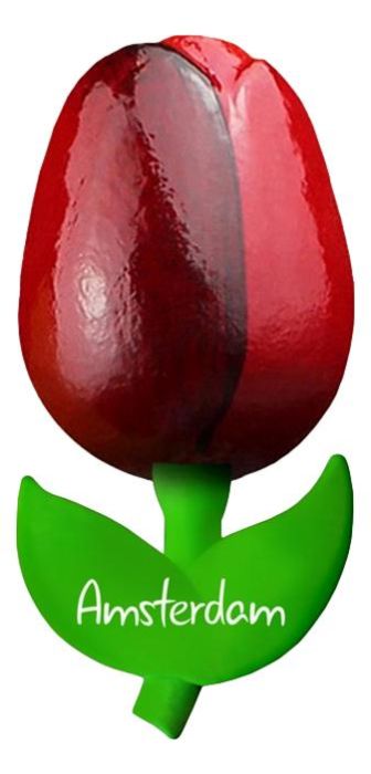 Onder de tulp zit een plastic stengel met daarop de tekst "Amsterdam".