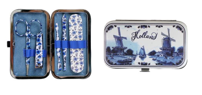 Goed gevuld manicure setje versierd met een Delfts blauwe molen op de voorkant. Dit metalen doosje heeft een klik sluiting en bevat een pincet, nagelvijl, schaartje en nagelknipper. Leuk om te geven, handig om mee op reis te nemen.