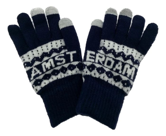 Koude vingers ? Dit zijn lekker warme handschoenen met een fleurig ontwerp. Deze blauwe vinger mannen handschoenen zijn versierd met de tekst "Amsterdam".