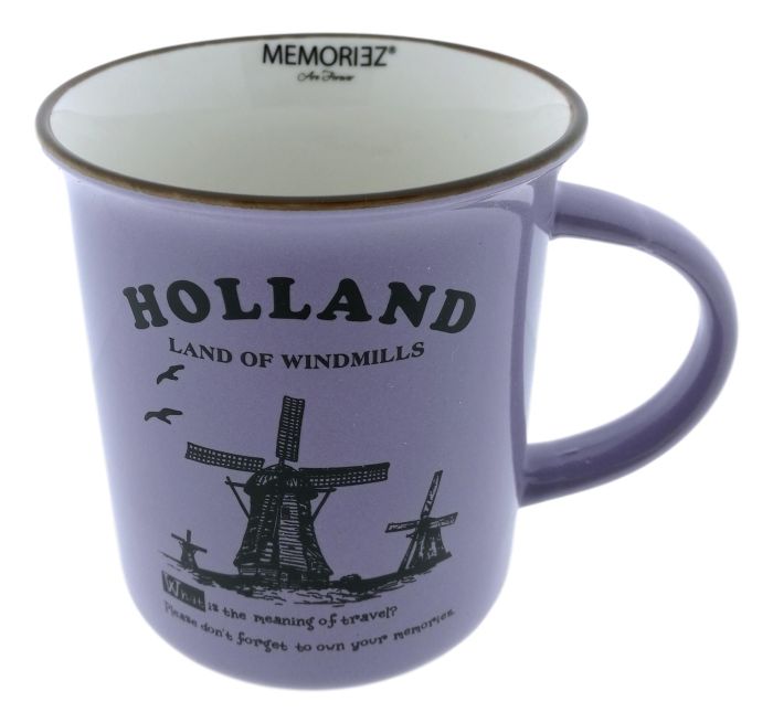 Mok gemaakt van ivoorporselein (new bone) in het paars versierd met een pentekening van Hollandse molens. Op de achterkant staat een uitgebreide tekst.