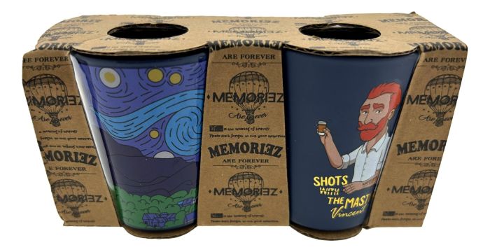 Twee donkere doorzichtig versierde shot glasses met Vincent van Gogh thema, verpakt in een net cadeaudoosje. Een leuk en eenvoudig mee te nemen geschenkje.