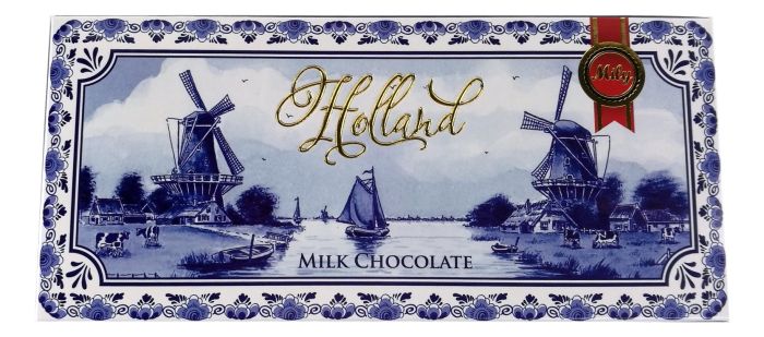 Grote plak met lekkere Mily melk chocolade. In mooi glimmend met goudkleur versierde verpakking met een Hollands windmolen landschap.