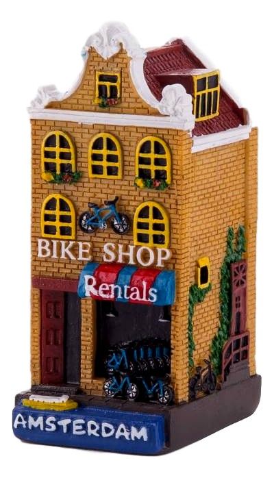 Klein Amsterdamse grachtenpandje versierd met een fietsenwinkel.