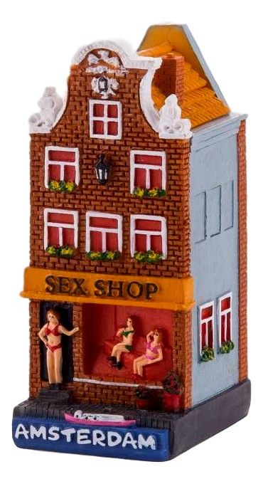 Klein Amsterdamse grachtenpandje versierd met een seks winkel.