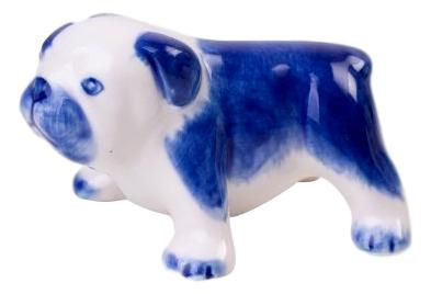 Deze bulldog is gemaakt van aardewerk en in het wit/blauw gekleurd.