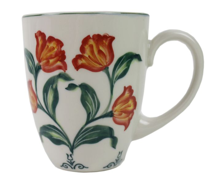 Mooie keramische mok met een handvat. Deze mok is versierd met groene bladeren en oranje tulpen. De mok is 11,5 cm hoog en heeft een diameter van 8 cm.