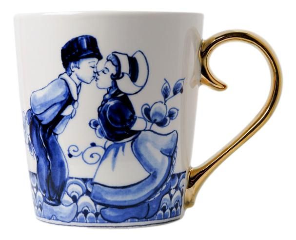 Deze prachtig vervaardigde grote mok is voorzien van een Hollands kussend boerenpaar in prachtige delftsblauwe kleuren en voegt een vleugje elegantie en charme toe aan je koffie-ervaring.