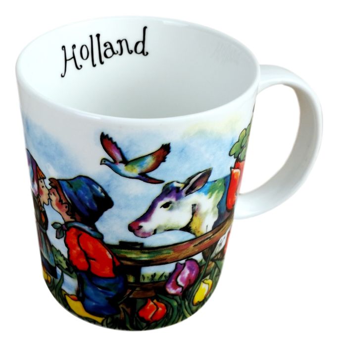 Mooie grote koffie of thee mok versierd voorop met een kussend paar in een boerenlandschap met boerderij, koe en tulpen. De tekst "Holland" staat in de binnenkant van de kop.