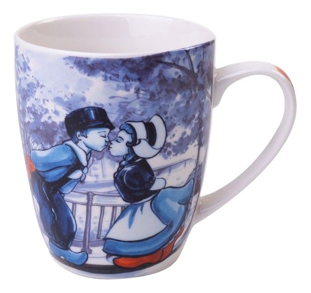 Deze mooie mok is versierd met een Delfts blauwe tekening van het beroemde kussende paar in oud Hollands kostuum voor de grachten van Amsterdam. De oranje houten klompen contrasteren mooi tegen het Delfts blauwe van de tekening.