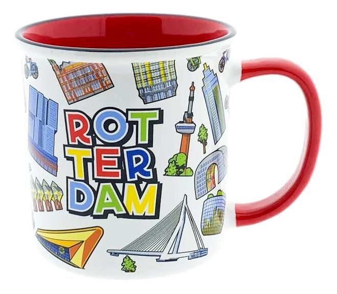 Deze vrolijk gekleurde Rotterdamse mok is er voor iedereen die van de stad houdt. Rotterdamse herkenningspunten en de tekst "Rotterdam" versieren de beker in heldere kleuren. De mok is gemaakt van keramiek en heeft een rode handgreep.