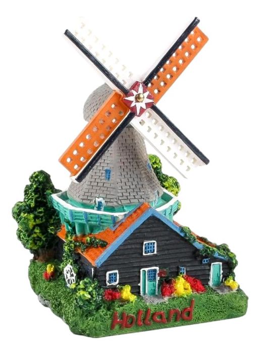 Mooi gekleurde stellingmolen (molen bovenop een huis) in een landschap. De molen is gemaakt van polystone, een kunststeen die het mogelijk maakt om veel details toe te passen. De wieken van de molen kunnen bewegen.