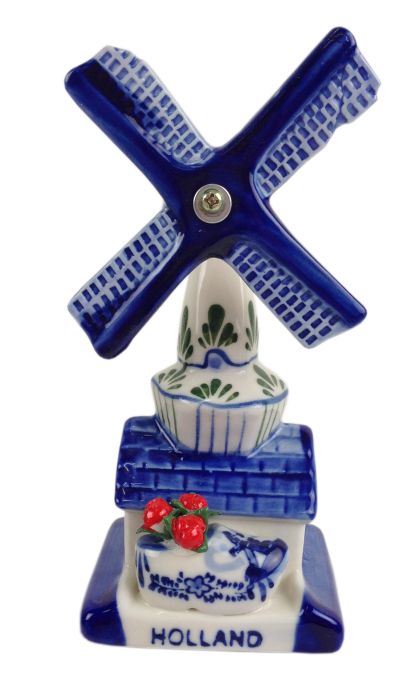 Delfts blauwe molen gemaakt van keramiek. De molen is versierd met een klompje.