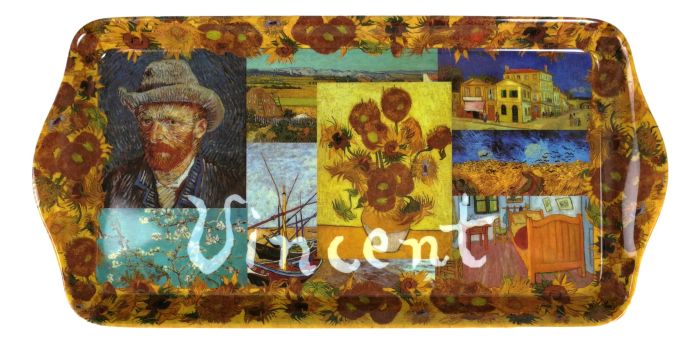 Langwerpig dienblad met een collage van Van Gogh's schilderijen, omringt door fel gekleurde zonnebloemen. Dit dienblad is gemaakt van hard plastic. Het dienblad is niet geschikt om in de magnetron te plaatsen. De afmetingen van het dienblad zijn 30 cm x 15 cm.