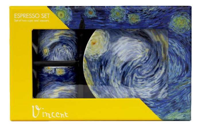 Een mooie gift set met 2 espresso kopjes met een afbeelding van Vincent van Gogh. De kopjes zijn verpakt in een mooie doos met venster. Starry night, Vincent van Gogh.