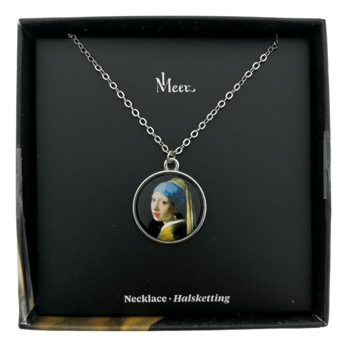 Halsketting met het meisje met parel als versiering in een kartonnen cadeaudoosje.