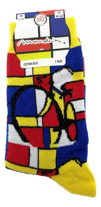 Fel gekleurde Mondriaan sokken, met verrassing, een fiets patroon.