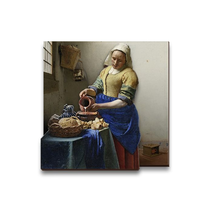 Deze koelkastmagneet is versierd met het beroemde werk van Johannes Vermeer, het Melkmeisje. De magneet is gemaakt van hout en heeft een grote stevige platte magneet aan de achterkant. Omdat de magneet bestaat uit 2 lagen geeft het een 2D effect. De afmetingen van de magneet zijn 7 cm bij 7 cm.