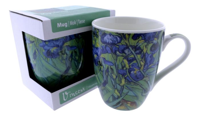 Mooie grote mok versierd met de Irisssen van Vincent van Gogh in een kartonnen doosje. Heel geschikt als een passend geschenk.