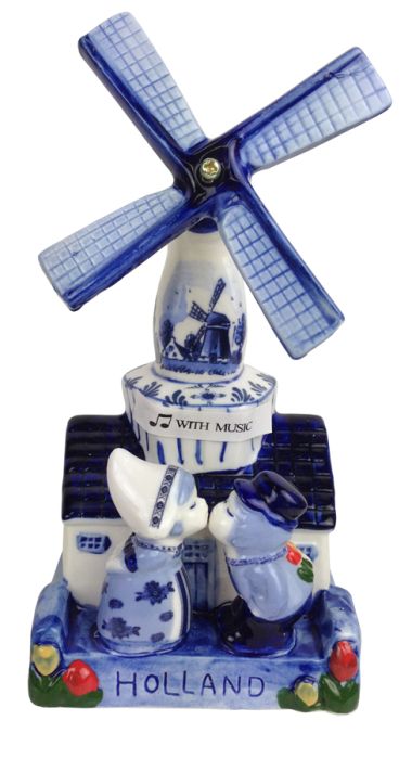 Delftsblauwe muziekmolen met kussend paar. Wordt geleverd in stevige doos. De molen is 10x10x19.
