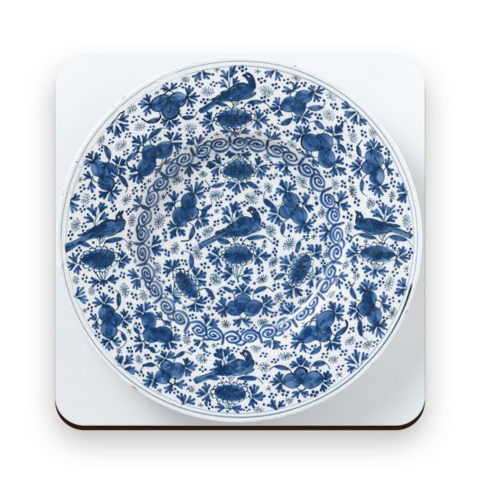 Enkele onderzetter met daarop een afbeelding van het bord van faience zoals dit in het Rijksmuseum te vinden is.