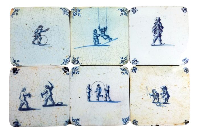 Set van 6 mooie stevige onderzetters met afbeelding van oudhollandse delftsblauwe tegels waarop spelende kinderen.