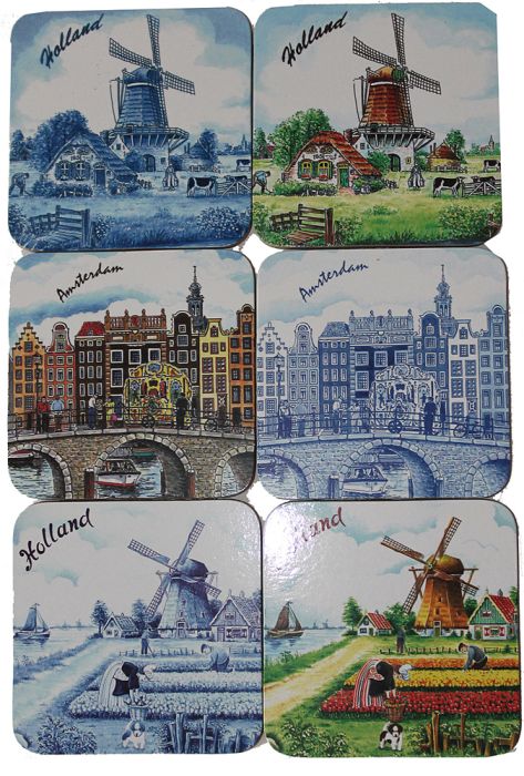 Set van 6 onderzetters; 3 gekleurd 3 delftsblauw.