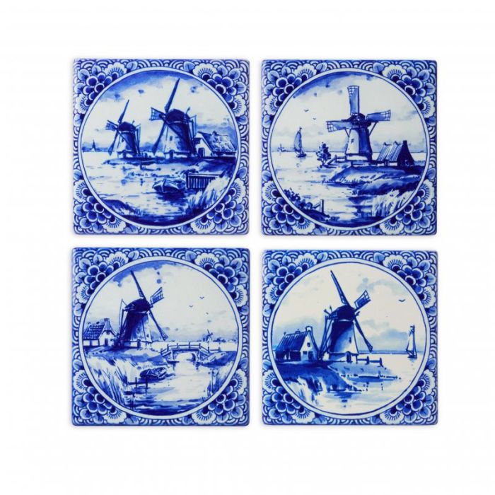 Setje van vier keramieken onderzetters in een doosje. De onderzetters zijn versierd met verschillende bekende Nederlandse molenlandschappen.